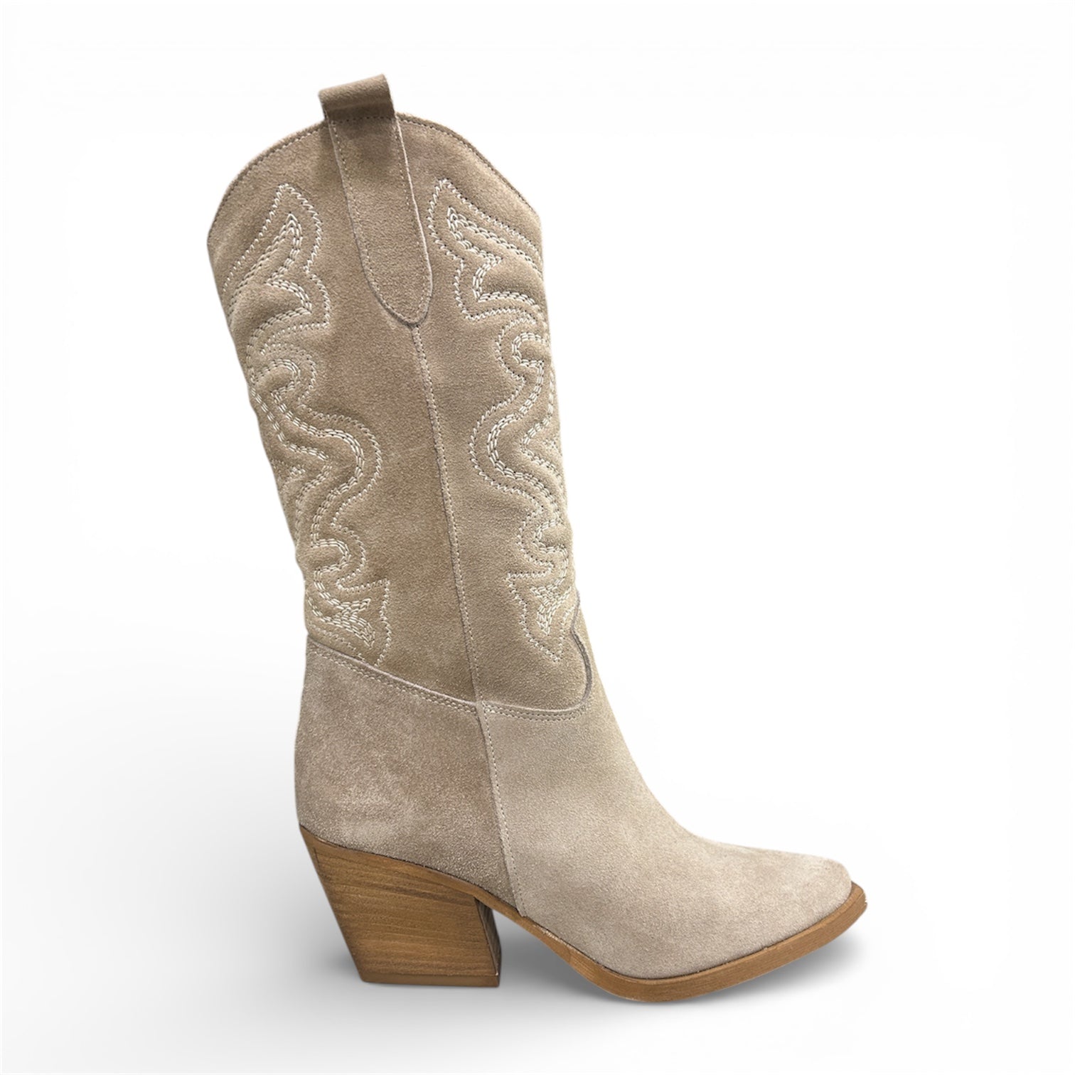 Stivale texano tacco, fondo in gomma e soletto interno in vera pelle. Tomaia in morbida pelle scamosciata con ricami sul gambale